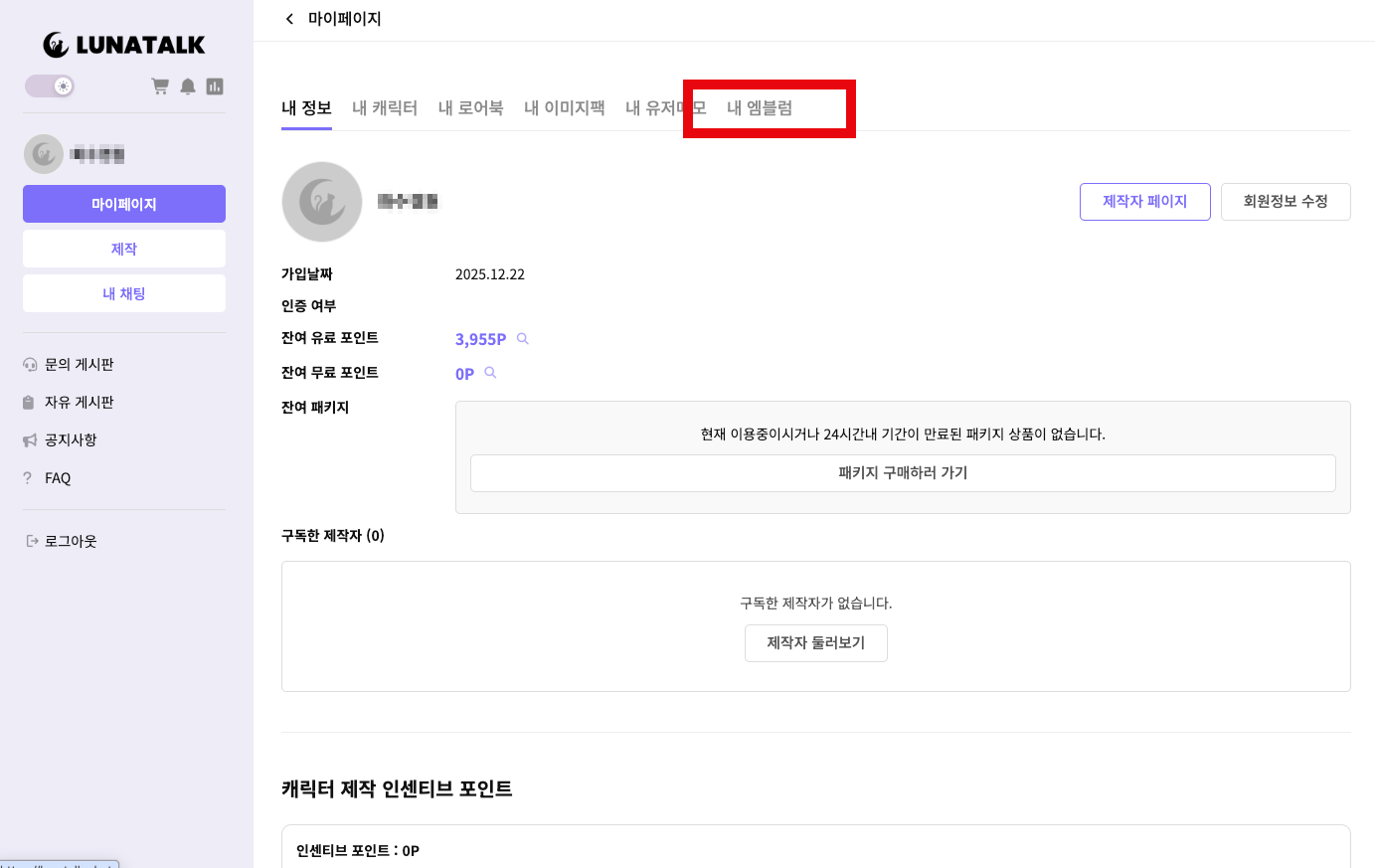 엠블럼은 먼저 마이페이지 -> 상단에 내 앰블럼을 통해 확인할 수 있다냥