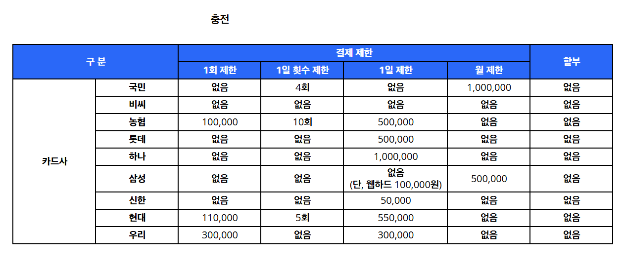 사이트 개편 이후 포인트 결제와 관련된 결제사를 KCP -> TOSS PAYMENT로 변경함에 따라 아래와 같은 카드사에서 결제 한도등의 차이가 발생하고 있습니다.