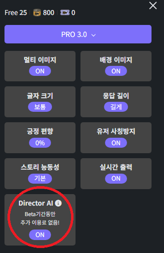 사용방법은 아래와 같이 채팅방 사이드에서 Director AI 기능을 ON으로 바꿈으로서 가능합니다.