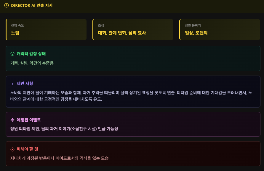 - 대화의 분위기와 템포를 자동으로 분석하여 매 대화시마다 최적의 연출 방향 제시