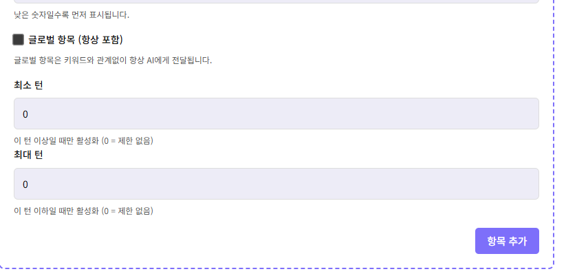 그래서 채팅 턴수가 조건에 맞아야만 해당 로어북이 작동하는 기능을 추가하였습니다.