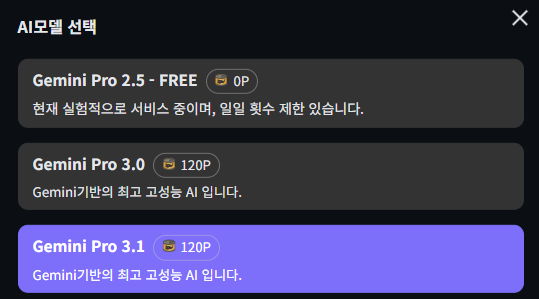 채팅방의 AI 선택 창에서 사용가능하시며 가격은 동일합니다.