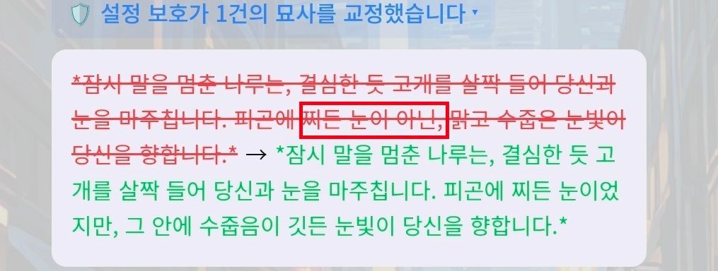 대화가 출력되고 난 뒤 자동으로 2차 검수를 진행하여 설정과 다른부분 혹은 불필요하게 안경 묘사 등이 들어가 있는 부분을 확인하여
