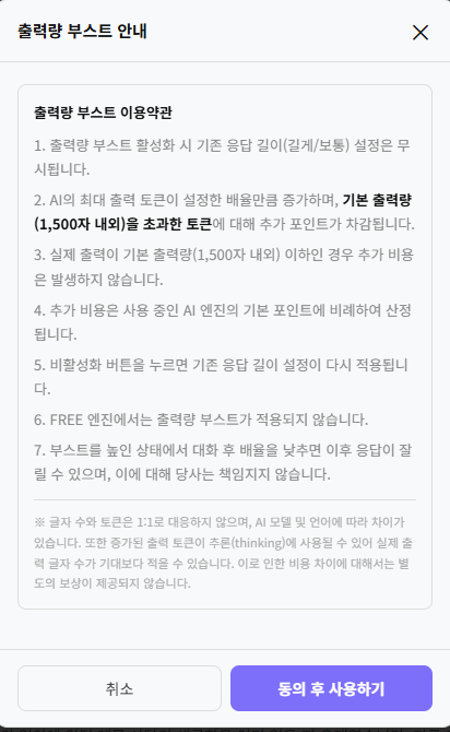 출력량 부스트 기능은 AI의 응답 출력량을 기본 대비 최대 5배 까지 늘릴 수 있는 프리미엄 기능입니다.