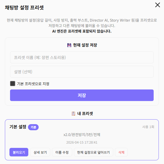 - 현재 설정 저장: 프리셋 이름(예: "장편 스토리용")과 설명을 입력 후 저장