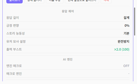 - 전체 설정 일괄 저장: 응답 제어부터 Director AI, Story Writer, 랜덤 이벤트까지 한 번에 저장